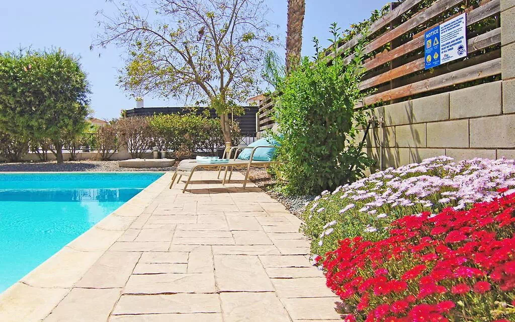 Situación: en la periferia de Ayia Thekla, en el barrio de Ayia Napa. Vista desde la vivienda al jardín.