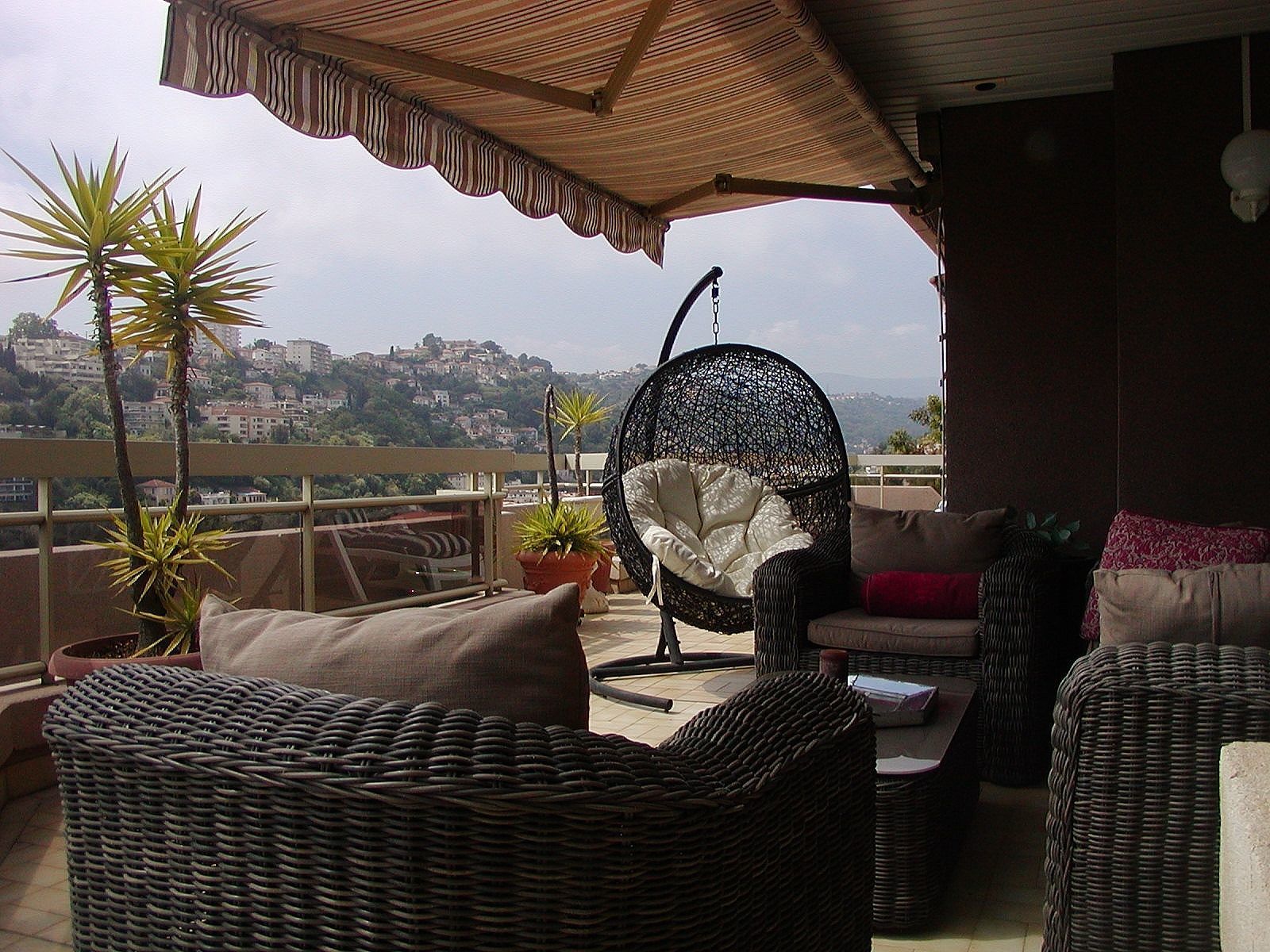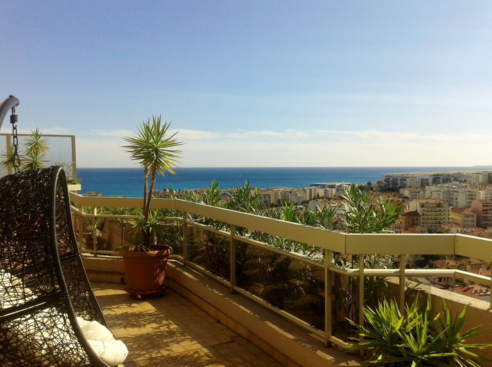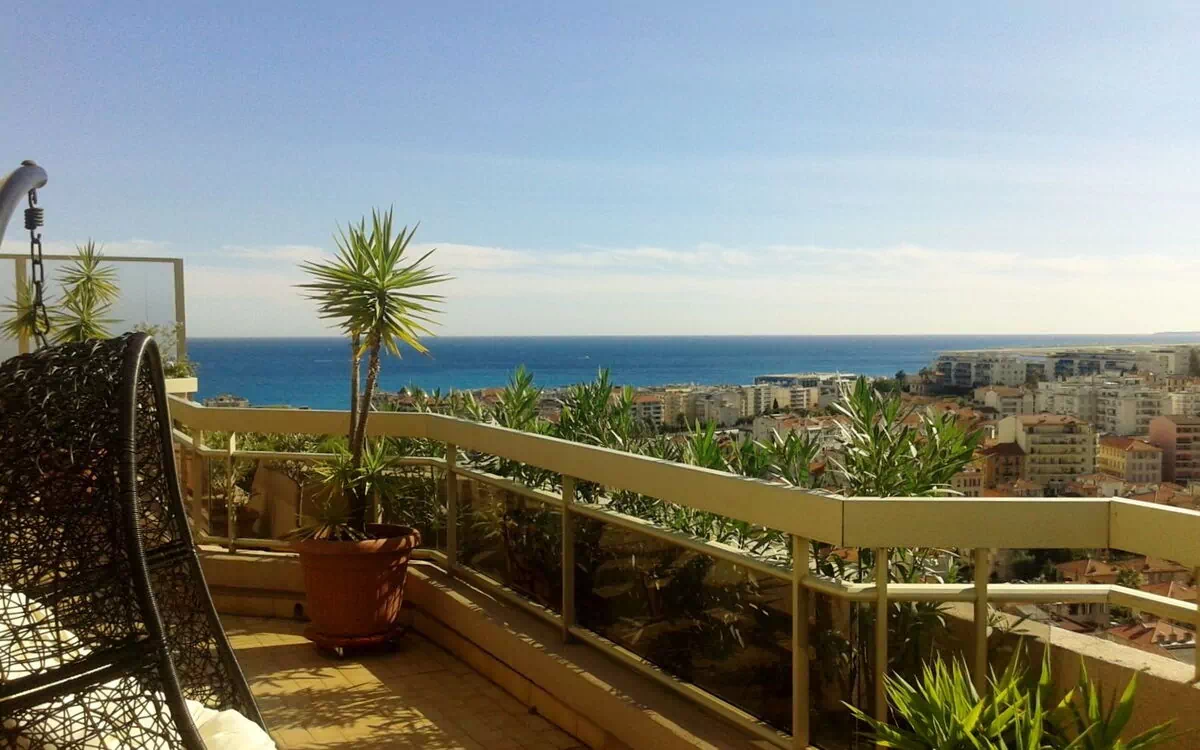 Chateau Miramar, Nice. Great apartment for 6 people with 2 bedrooms within walking distance to the beach in Nice, Cote d'Azur. The apartment, which is 100 m2, is located on the 5th floor of a big domain with park. The domain is safe and closed with electric gate. In the basement is a garage with space for two cars. From the large terrace of 120 m2 that surrounds most of the apartment, you have a beautiful view over Nice and also a wonderful sea view. The terrace has furniture, a dining area, a cozy sitting area and a barbecue, so you have every opportunity to enjoy the warm summer evenings.