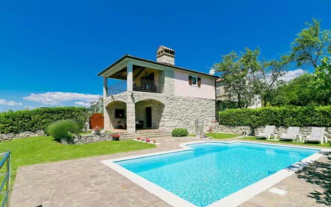"Panorama 2" es una casa de vacaciones de 2 plantas ubicada en el tranquilo distrito de Čekadi, a 700 metros del centro de Labin, Croacia. La propiedad se sitúa en una posición elevada y soleada rodeada de paisaje rural, sobre una generosa parcela privada de 7.000 metros cuadrados que proporciona amplitud, privacidad y belleza natural. El jardín cuenta con un césped bien mantenido que crea un entorno sereno para descansar y conectar con la naturaleza.