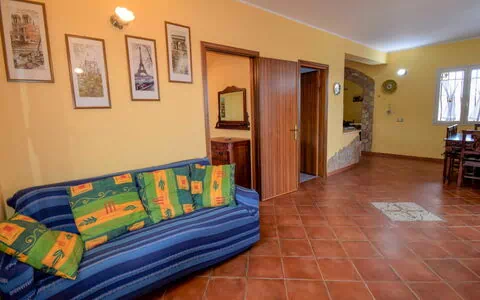 Villa 3 habitaciones 80 m2. Con mobiliario funcional y confortable: salón-comedor grande con TV satélite (pantalla plana). Salida a la terraza-jardín. 1 dorm. doble. 1 dorm. con 1 cama y 1 cama-nido. Cocina abierta (5 fogones, horno pequeño, horno, congelador) con mesa de comedor. Salida a la terraza-jardín. Ducha/bidet/WC. Calentador (80 litros). Terraza 30 m2, cubierta, terraza-jardín grande 80 m2, cubierta. Muebles de terraza, barbacoa. Vista al paisaje. El alojamiento dispone de: lavadora, plancha, secador de pelo. Internet (Wifi, gratis). 1 mascota pequeña / perro.