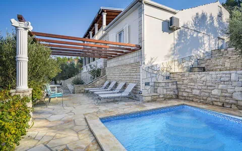 Los espacios exteriores de "Borovina" aprovechan al máximo la ubicación privilegiada de la propiedad. La finca vallada de 5.000 m2 dispone de amplios espacios para la relajación y actividades al aire libre. La piscina privada angular mide 7 x 3 m, con una superficie de 24 m2 y una profundidad de 150 a 170 cm; está disponible del 1 de junio al 30 de septiembre y cuenta con una escalera interior para facilitar el acceso. Un área de barbecue permite disfrutar de cenas al aire libre. Los huéspedes más jóvenes disponen de un parque infantil dedicado con tobogán y una cama elástica para entretenimiento al aire libre. La playa, a solo 20 m de distancia tras cruzar una carretera, es fácilmente accesible y ofrece opciones de playa rocosa y de hormigón.