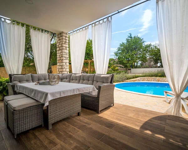El jardín vallado se extiende sobre los 900 m2 de la propiedad, integrando un césped cuidado con una zona de jardín silvestre que invita al relax y la conexión con la naturaleza. La piscina redonda mide 6 m de diámetro y 150 cm de profundidad; está disponible del 15 de abril al 25 de octubre. Una ducha exterior se encuentra cerca de la piscina, permitiendo a los huéspedes refrescarse después del baño. La propiedad dispone también de una zona de barbecue para disfrutar de cenas al aire libre durante las noches istrias.
