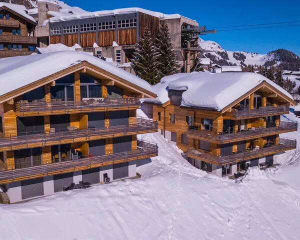 El primer dormitorio cuenta con una cama doble y un baño en suite equipado con bañera, inodoro y lavabo; el segundo dormitorio ofrece 2 camas individuales y televisión privada. El segundo baño está equipado con ducha a ras de suelo con alcachofa de lluvia, inodoro y lavabo. La cocina de planta abierta está completamente equipada con horno, vaporera, placa de cocción, lavavajillas, cafetera y más, fluyendo sin interrupciones hacia la sala de estar, que cuenta con sofá cama y televisión. El alojamiento cuenta con conexión Wi-Fi disponible en la propiedad. El edificio se adhiere al estándar Minergie y funciona con un concepto energético ecológico impulsado por una bomba de calor geotérmica. Una sala compartida de esquí y bicicletas está disponible dentro del edificio, ofreciendo un espacio práctico y seguro para almacenar equipos durante la estancia. El precio del alquiler es exclusivo de la tasa turística, limpieza final y ropa de cama, toallas y ropa de cocina, que se cobran por separado.