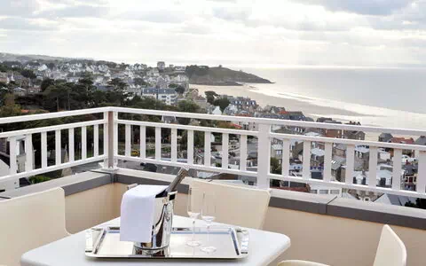 Resort "Villas du Spa". 3 casas en la residencia. 53 apartamentos en la residencia. A 200 m del centro de Pleneuf-Val-André, en una pendiente, a 200 m del mar. Comunitario: piscina cubierta (10 x 9 m, Disponible por temporada: 01.Ene. - 31.Dic., extra) con agua de mar. En el complejo: recepción, restaurante, bar, gimnasio (extra). Masaje (extra). Baño turco (extra). Ascensor, lavadora, secadora (uso comunitario, extra). Acceso por escaleras hasta la casa. Aparcamiento en el mismo terreno. Tienda 200 m, supermercado 1.2 km, parada autobús "Dahouêt" 1.9 km, playa de arena 200 m. Campo de golf (18 hoyos) 2 km, escuela de vela 200 m, tenis 700 m, centro ecuestre 2 km. A tener en cuenta: La foto corresponde a una de las viviendas. Los alojamientos pueden diferir en la superficie habitable, la distribución de las estancias, el equipamiento y el mobiliario. El edificio con la recepción, el restaurante y el bar es accesible por escaleras. La zona de bienestar con piscina de agua de mar, baño de vapor y sala de fitness (acceso permitido a partir de los 18 años) sólo es accesible en conexión con los tratamientos de belleza. Los huéspedes del GRUPO INTERHOME reciben un 15% de descuento en los tratamientos de belleza "a la carta" del Spa Marin du Val André.