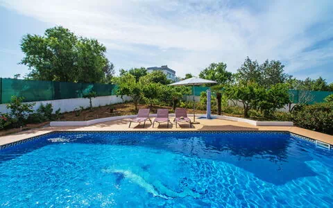 La piscina privada mide 10 x 5 metros con una profundidad de 100 a 200 cm y está disponible durante todo el año, del 1 de enero al 31 de diciembre. Una ducha exterior permite enjuagarse después del baño. El patio compartido y el terreno vallado de 1.800 m², adornado con diversas plantas y árboles, crean un ambiente sereno y sombreado ideal para relajarse y disfrutar de la belleza natural del campo del Algarve.