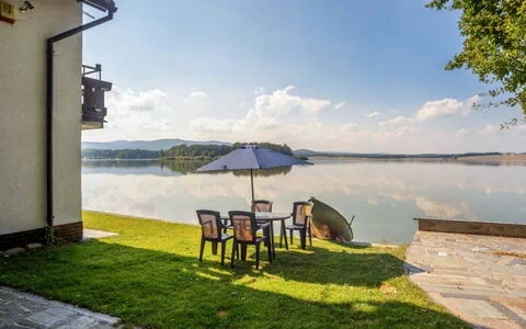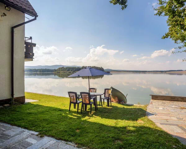 El chalet "Panorama" es una casa de vacaciones independiente situada en el corazón de la República Checa, a 400 metros sobre el nivel del mar en la tranquila aldea de Dehtáře, dentro de la región de Prachatice. La propiedad, de cuatro plantas, se encuentra en las afueras de Holašovice en una posición soleada y tranquila directamente junto al lago. El chalet se asienta sobre una generosa parcela privada de 420 metros cuadrados que incluye un frondoso jardín con árboles y prado abierto, creando una atmósfera de completa tranquilidad y aislamiento.