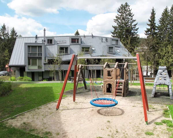 El terreno exterior compartido se extiende a lo largo de 200 metros cuadrados y está equipado con un parque infantil dedicado que incluye tobogán y columpio para los huéspedes más jóvenes. El entorno natural de la propiedad se ve realzado por la proximidad del bosque, cuyo borde se encuentra a tan solo 50 metros de distancia, invitando a paseos tranquilos y al contacto directo con el paisaje boscoso circundante.