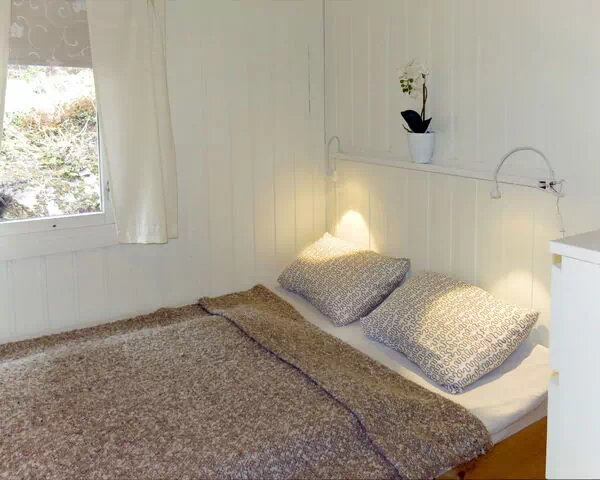 La villa "Evabu" tiene una superficie de aproximadamente 40 m2 distribuida en una planta, con capacidad máxima para 4 huéspedes, 2 dormitorios y 1 baño. La zona de estar y comedor constituye el espacio principal de la vivienda, equipada con mesa de comedor y acceso directo a una terraza privada. El primer dormitorio dispone de una cama doble de 140 cm de ancho y 190 cm de largo. El segundo dormitorio es una habitación infantil con 3 camas de 60 cm de ancho y 190 cm de largo cada una; la distribución de camas es flexible y ofrece más opciones de descanso que el número máximo de huéspedes permitido, aunque la capacidad máxima de 4 personas no debe ser superada en ningún caso. El baño está equipado con ducha y WC. Los suelos de madera cálida recorren toda la propiedad.