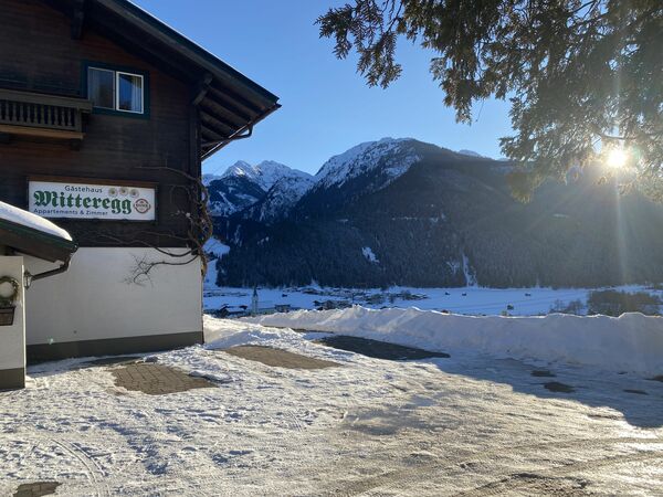 El exterior de la casa "Mitteregg" refleja la belleza natural de su ubicación alpina. El terreno ofrece un ambiente acogedor donde los huéspedes pueden relajarse y disfrutar de las vistas de montaña. Los espacios al aire libre proporcionan un entorno tranquilo para aprovechar el aire fresco de la montaña durante todas las estaciones, tanto en los cálidos meses de verano como en el invierno, cuando el paisaje se transforma en un panorama cubierto de nieve.