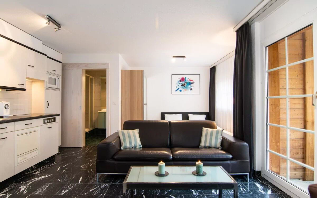 Directly located in the skiing and hiking area, the bright and modern apartment offers you a west-side balcony and a high-standard interior. With its 29 sqm, its queensize-bed and the bathroom with shower and WC it is the perfect single or couple apartment. The sunny westside-balcony invites you to enjoy the stunny views. The kitchenette is equipped with coffeemachine, cooking facility, small oven, dishwasher, microwave and a combinated fridge/freezer. On top of that you will find a toaster and a fondue-set. The living area contains a dining table, a sofa and a flatscreen-TV. WIFI can be used of course for free. The apartment is located on the 2. floor of the building and can be reached by elevator. In the basement you will find a private skiroom.