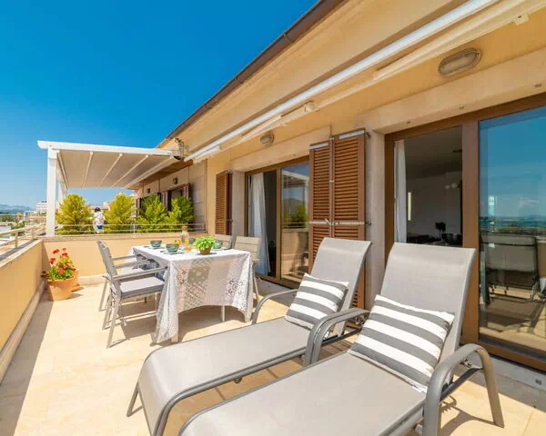 La quinta planta alberga una amplia sala de estar y comedor con puerta corredera de gran tamaño, ventanal panorámico y mesa de comedor, desde la cual se accede directamente a la terraza. El primer dormitorio doble dispone de ventanal panorámico, cama francesa de 150 cm de ancho y 200 cm de largo, y salida propia a la terraza. El segundo dormitorio doble cuenta con ventanal panorámico y está amueblado con 2 camas individuales de 90 cm de ancho y 190 cm de largo. La cocina, integrada con la sala de estar, incluye mesa de comedor y acceso directo al balcón. El baño está equipado con ducha y WC. Una amplia terraza amueblada con mobiliario de exterior ofrece vistas panorámicas del mar, las montañas y la bahía.