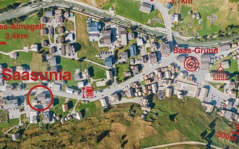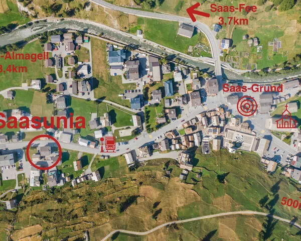 La parada de autobús Altersheim, desde la cual salen autobuses directamente hacia la estación de esquí de Saas-Fee, se encuentra a 50 metros de la propiedad. La estación del teleférico Hohsaas en Saas-Grund está a aproximadamente 700 metros, abriendo acceso a terreno de mayor altitud para esquí y excursiones. Restaurantes se encuentran a 300 metros de la propiedad. El área circundante ofrece una amplia variedad de actividades durante todas las estaciones, incluyendo esquí, esquí de fondo, senderismo y ciclismo. El valle de Saastal en su conjunto proporciona un extraordinario parque natural.
