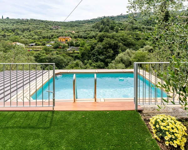 Il giardino terrazzato si estende per circa 1.000 metri quadrati ed è generosamente piantumato con una varietà di alberi e arbusti che offrono ombra naturale e un senso di privacy. La piscina condivisa misura 5 x 4 metri con una profondità di 130 centimetri ed è disponibile dal 15 aprile al 30 ottobre. Le terrazze del giardino circostante offrono ampio spazio per rilassarsi e godere della bellezza naturale del paesaggio ligure.