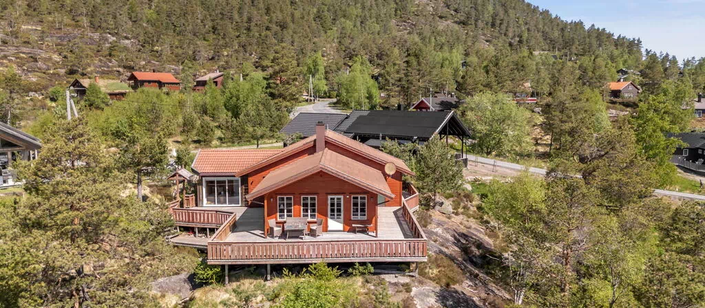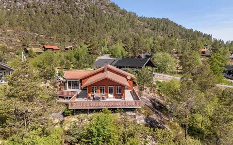 La casa de vacaciones "Eikebu" se encuentra en el distrito de Eikerapen, en Øyuvstad, Noruega, a una altitud de 370 metros sobre el nivel del mar. Esta casa de madera se alza en una posición elevada y soleada sobre una ladera natural, combinando carácter rústico con comodidad genuina. La propiedad dispone de una parcela privada generosa de 650 metros cuadrados en estado natural, con un prado abierto que realza la sensación de espacio y libertad. El terreno, con sus extensiones naturales y su entorno de pradera, ofrece una conexión auténtica con el paisaje noruego.