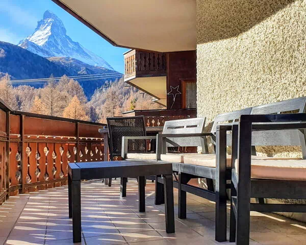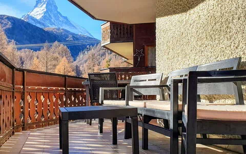 La casa de vacaciones ocupa 101 m² distribuidos en planta baja y aloja a un máximo de 6 huéspedes en 3 dormitorios y 2 baños. Reformada en 2021, la propiedad presenta interiores luminosos y modernos con mobiliario de inspiración escandinava. La zona de estar y comedor de planta abierta se articula en torno a una estufa de leña de estilo escandinavo y dispone de mesa de comedor. Desde la zona de estar se accede directamente a un balcón de 32 m² con vistas al Matterhorn. El primer dormitorio doble está amueblado con una cama doble compuesta por 2 colchones individuales de 90 cm de ancho y 200 cm de largo, y también da acceso al balcón. El segundo dormitorio doble dispone de una cama doble de 160 cm de ancho y 200 cm de largo. El tercer dormitorio doble está configurado con una cama doble compuesta por 2 colchones individuales de 90 cm de ancho y 200 cm de largo. Cada uno de los 3 dormitorios está equipado con televisor. La casa incluye 2 baños: uno con bañera y WC, y otro con ducha y WC.