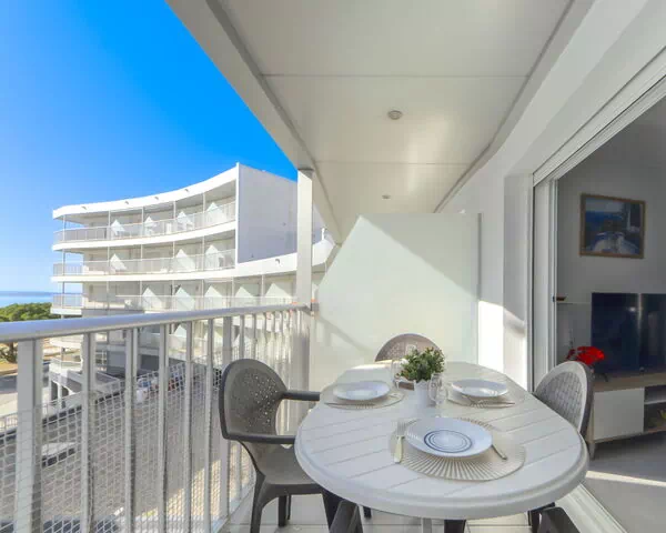 El apartamento tiene una superficie de 50 m² distribuida en una única planta, ubicada en la tercera planta del edificio, y aloja un máximo de 4 huéspedes en 1 dormitorio y 1 baño. La zona de estar y dormir está amueblada con una cama doble plegable de 135 cm de ancho y 190 cm de largo, una mesa de comedor y acceso directo a la terraza mediante una salida orientada al sur. El dormitorio separado dispone de una cama francesa de 140 cm de ancho y 190 cm de largo, ofreciendo un espacio de descanso privado y confortable. La cocina, de reducidas dimensiones, está completamente equipada y se abre hacia la zona de estar. El baño con ducha incluye WC. El apartamento dispone de una terraza de 5 m² orientada al sur, amueblada con mobiliario de exterior, que ofrece vistas laterales al mar.