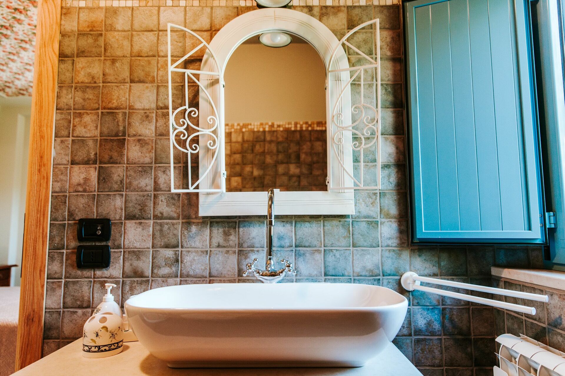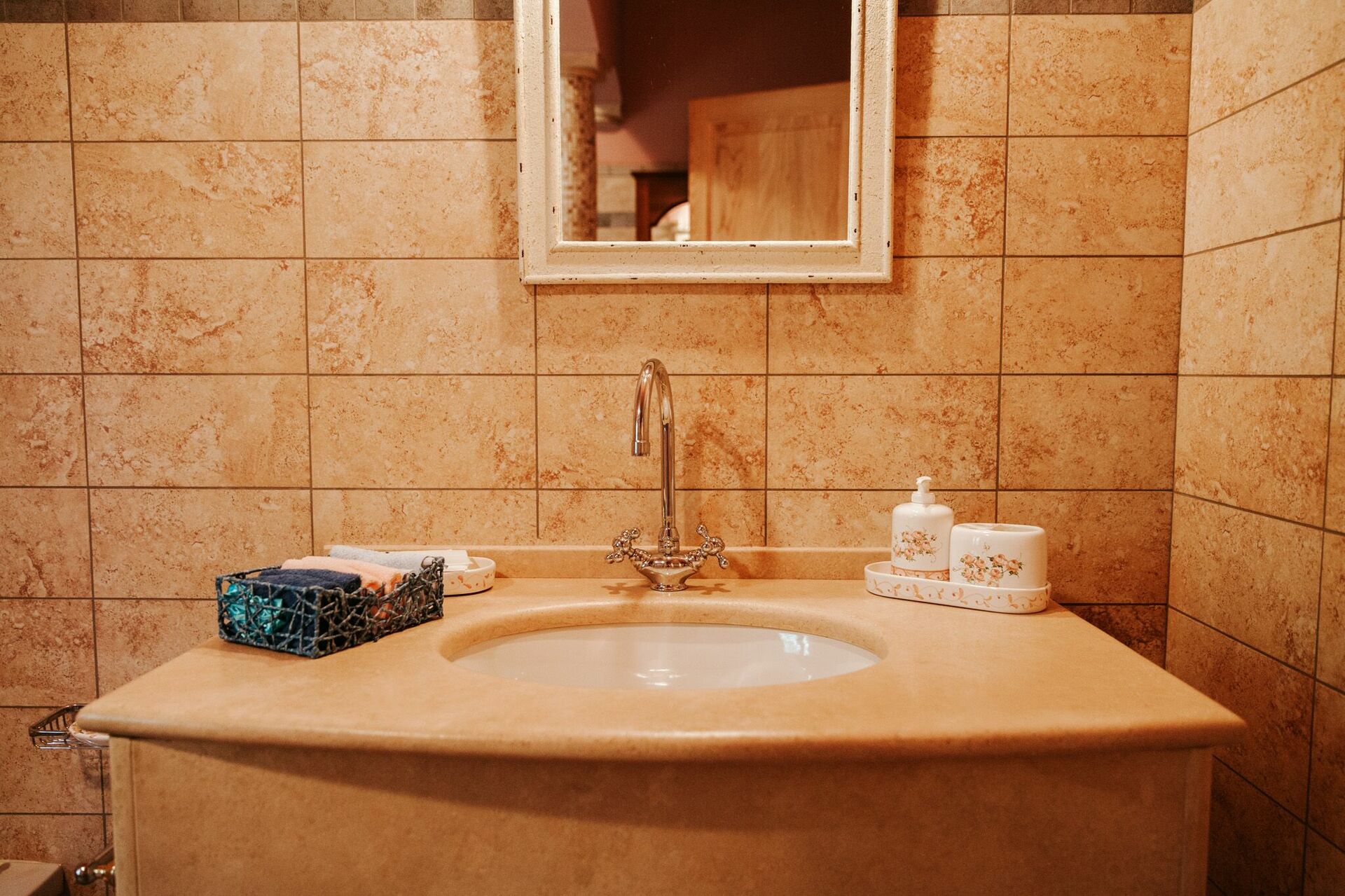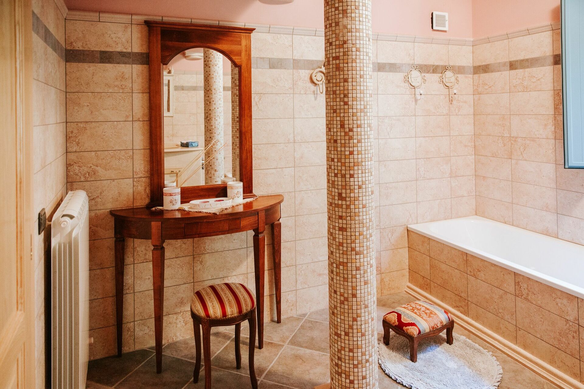 Habitación con baño 2: cama doble, WIFI internet, sillón, escritorio, lavabo, baño, bidé, ducha, secador.