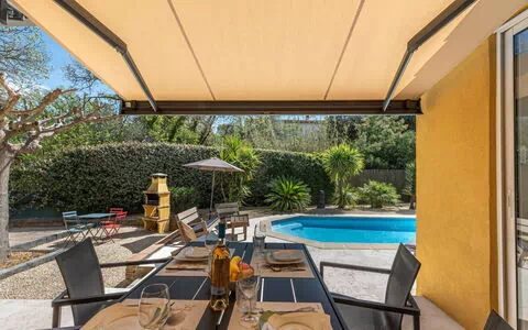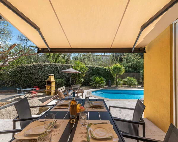 El jardín privado vallado es espacioso y bien cuidado, ofreciendo un entorno tranquilo donde disfrutar del clima mediterráneo en total privacidad. La piscina mide 4 x 8 metros con profundidad de 80 a 140 cm y está equipada con un sistema de alarma de seguridad; está disponible del 1 de abril al 30 de octubre. El área exterior también cuenta con una pista de boules para disfrutar de este pasatiempo francés clásico.