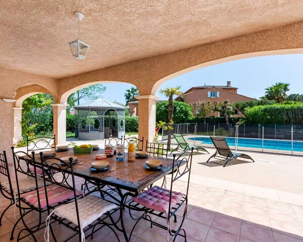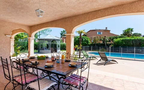 Villa "Massenet" es una elegante casa de vacaciones construida en 2002, ubicada en un tranquilo barrio residencial de Saint Aygulf, Francia. Situada a aproximadamente 1,5 km del centro de Saint Aygulf y a tan solo 2 km del mar, la villa goza de una excelente ubicación que combina la proximidad de servicios locales con la serenidad de una zona de tráfico limitado. La propiedad se asienta sobre una parcela privada completamente vallada de 1.100 m², proporcionando un generoso sentido de espacio y privacidad. La piscina angular de sal, que mide 10 x 5 m con profundidades entre 120 y 200 cm, es el elemento central de los terrenos.