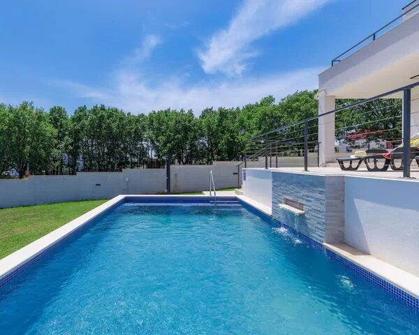 Villa "Tara" es una villa moderna de dos plantas ubicada en la localidad costera de Medulin, Croacia. La propiedad, completamente vallada, ocupa una parcela privada de 1.000 metros cuadrados y garantiza privacidad y seguridad durante la estancia. La piscina exterior angular climatizada mide 8 x 4 metros con una profundidad de 140 cm y está disponible del 1 de abril al 1 de noviembre. El jardín bien mantenido con césped contribuye a crear un ambiente tranquilo alrededor de la villa.