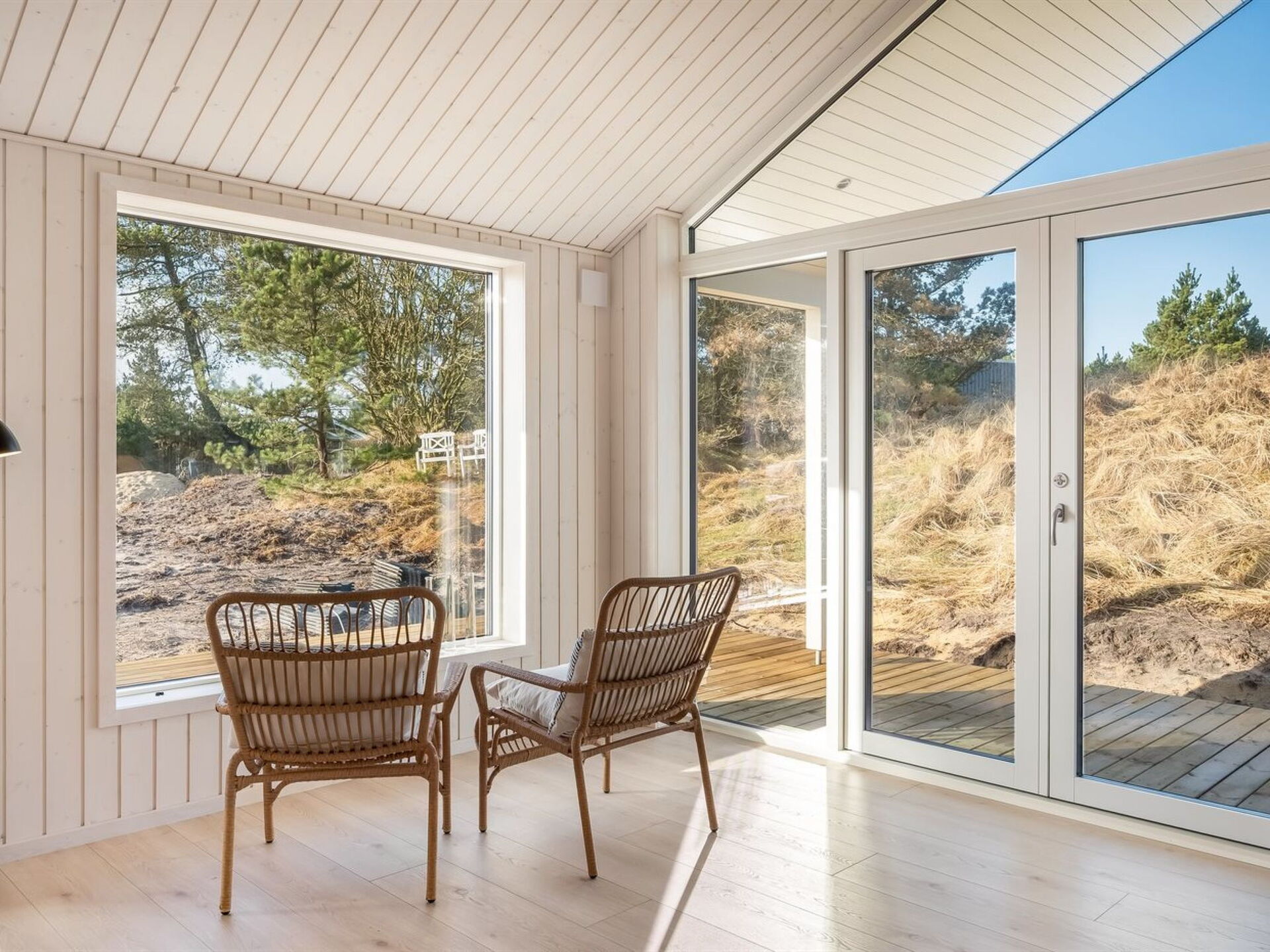Los espacios exteriores se definen por la vasta parcela natural de 3.300 metros cuadrados que rodea la casa y crea una auténtica sensación de aislamiento e inmersión en el paisaje danés. Una terraza privada de 17 metros cuadrados ofrece un área dedicada para relajarse, cenar al aire libre o disfrutar de la atmósfera tranquila de los alrededores. El terreno se mantiene en su estado natural, preservando el paisaje en su forma original.