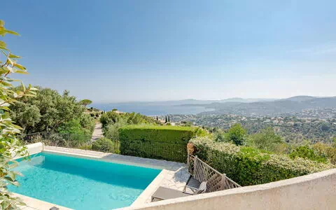 Los espacios exteriores están cuidadosamente diseñados para aprovechar el clima mediterráneo y la ubicación elevada en la colina. El jardín vallado privado se extiende a lo largo de 1.100 m2 de terreno bien mantenido, salpicado de árboles que proporcionan sombra natural y una sensación de aislamiento. La piscina privada mide 4 x 9 metros con una profundidad de 120 a 180 cm y está disponible del 1 de mayo al 30 de septiembre; cuenta con una escalera interior para facilitar el acceso y está asegurada por un cortinaje eléctrico rígido de plástico. También hay una ducha exterior disponible para los huéspedes.