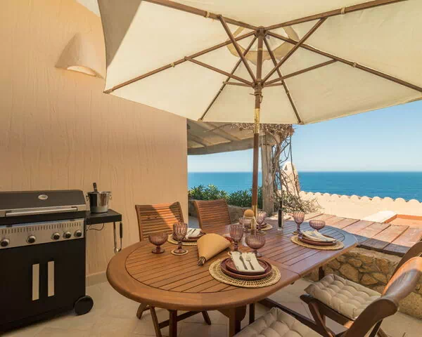 Villa Ilaria es una villa de 3 habitaciones con capacidad máxima de 6 huéspedes, distribuida en 2 dormitorios y 2 baños. La zona de estar y comedor es un espacio diáfano que integra una veranda, puerta corredera y ventanal panorámico, amueblado con sofá cama doble y chimenea de hogar abierto de carácter decorativo. Este espacio se abre directamente a la terraza y ofrece vistas al mar. El primer dormitorio es una habitación doble con acceso directo a ducha, bidé e inodoro privados, y comunica directamente con la terraza. El segundo dormitorio está equipado con 2 literas dispuestas en configuración 2 x 2 para mayor flexibilidad de alojamiento, y también accede a la terraza. Ambos dormitorios comparten un segundo baño con ducha, bidé e inodoro. La cocina completamente equipada dispone de 4 fogones, horno, tostadora, hervidor, congelador y cafetera eléctrica.