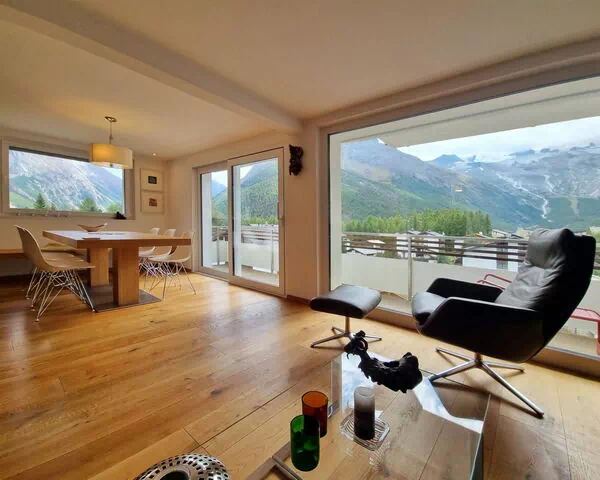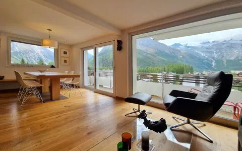 The flat is on the 3rd floor and has recently been completely renovated. The flat has 2 bedrooms and 2 bathrooms. One bedroom is equipped with a double bed, the second bedroom has 2 single beds. One bathroom is en-suite with bath, toilet & sink, the second bathroom has a shower, toilet & sink. The living room is bright and spacious with warm parquet flooring. The open, modern kitchen also leaves nothing to be desired. The highlight is the south-facing balcony with a fantastic view of the mountains of Saas-Fee.