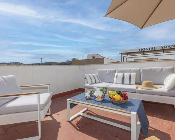 El entorno exterior de "Castell" refleja el carácter del barrio histórico circundante, donde la propiedad se beneficia de su posición en una zona de tráfico limitado que contribuye a un ambiente exterior tranquilo y agradable. Los alrededores inmediatos del casco antiguo ofrecen un paisaje urbano encantador típico de la arquitectura costera española tradicional, que invita a los huéspedes a disfrutar de paseos tranquilos por las calles antiguas.