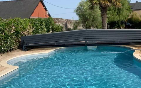 La terraza de 100 m2 ofrece amplio espacio para tomar el sol, comer y recibir invitados; está amueblada con mobiliario de jardín confortable. Hay una barbacoa disponible para disfrutar de comidas al aire libre. La piscina tiene forma de riñón, mide 11 x 6 metros con profundidad de 80 a 200 cm, y está disponible del 1 de mayo al 1 de septiembre; cuenta con una cubierta de protección. El jardín vallado de 1.000 m2, con su generoso césped y árboles sombreados, ofrece un espacio privado y pintoresco para descansar y disfrutar del entorno natural.