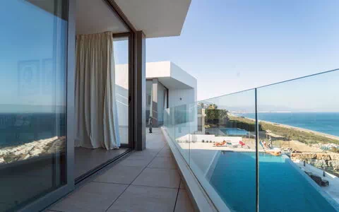 Las áreas exteriores incluyen 3 terraza amuebladas con mobiliario de exterior y 6 tumbonas con vistas panorámicas al mar.