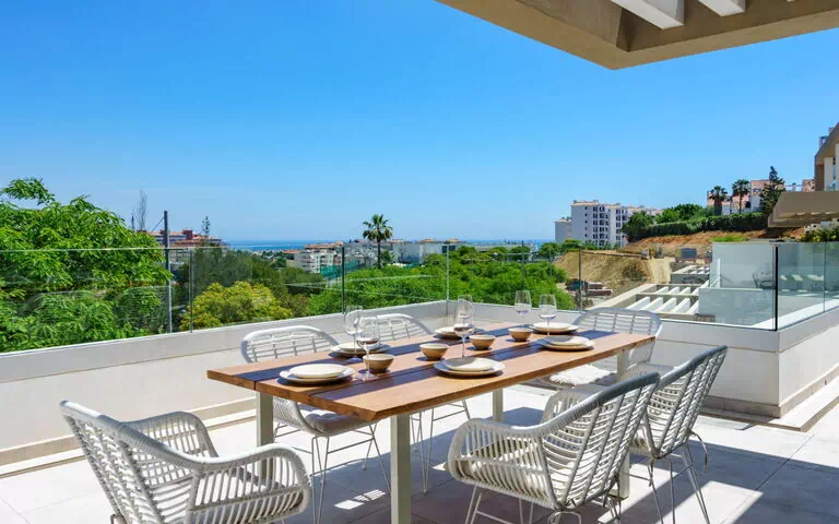 "South Bay", apartamento de 4 estancias 138 m2. Espacioso y luminoso, con mobiliario muy funcional y moderno: salón-comedor 30 m2 con mesa de comedor, baño, TV digital, aire acondicionado y bomba de calor, caliente. Salida a la terraza. 1 dorm. 11 m2 con 1 cama de matrimonio (160 cm, 200 cm de longitud), baño, aire acondicionado y bomba de calor, caliente. Salida a la terraza. 1 dorm. 10 m2 con 1 cama de matrimonio (160 cm, 190 cm de longitud). Salida a la terraza. 1 dorm. 10 m2 con 1 cama de matrimonio (160 cm, 190 cm de longitud). Cocina abierta 9 m2 (horno, lavavajillas, 1 Placas de inducción, 3 fuegos, tostadora, hervidor de agua eléctrico, microondas, cafetera eléctrica). Terraza grande 48 m2. Muebles de terraza. Vista lejana al mar. El alojamiento dispone de: lavadora, plancha, trona, cuna hasta 3 años, secador de pelo. Internet (Wifi, gratis). Plaza de aparcamiento n. 60 (1 coche). VUT/MA/67285