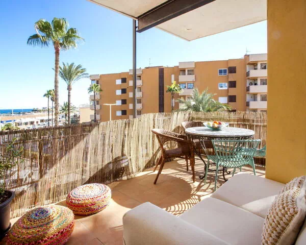 El apartamento "Vista del Arenal" tiene una superficie de 100 m2, se distribuye en una única planta y aloja un máximo de 4 huéspedes en 2 dormitorios y 2 baños. El salón comedor es de amplias dimensiones y dispone de un sofá cama de 130 cm de ancho y 200 cm de largo que ofrece flexibilidad en los arreglos de descanso; desde esta zona se accede directamente a la terraza de 24 m2, amueblada y con vistas al mar. El primer dormitorio está equipado con una cama francesa de 2 x 90 cm de ancho y 200 cm de largo, con baño privado integrado. El segundo dormitorio es de menor tamaño y cuenta con una cama individual de 90 cm de ancho y 200 cm de largo, con acceso directo a la terraza. La cocina es de concepto abierto integrada en el salón comedor. Un baño con ducha y aseo independiente completa las instalaciones sanitarias.