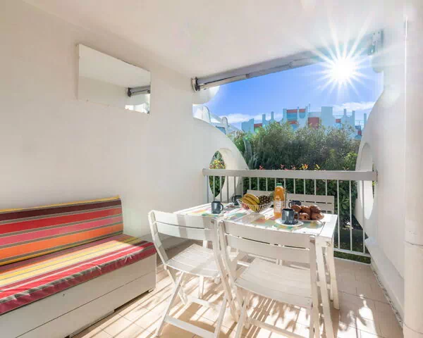 El apartamento tiene una superficie de 40 m² distribuida en una planta, con capacidad máxima para 4 huéspedes. Se sitúa en la primera planta con orientación sur, lo que garantiza excelente iluminación natural durante todo el día. El espacio integra un salón comedor de planta abierta con la zona de dormir y la cocina. El dormitorio dispone de una cama doble de 140 cm de ancho y 190 cm de largo. Una alcoba ubicada en la zona de planta abierta alberga una litera con 2 literas de 90 cm de ancho y 190 cm de largo cada una, destinada a huéspedes más jóvenes. La alcoba no está cerrada, sino integrada en la sección de planta abierta del apartamento. El apartamento cuenta con 1 baño con ducha y un aseo separado. Una kitchenette completamente equipada y una terraza orientada al sur de 7 m² amueblada con mobiliario de exterior completan la distribución.