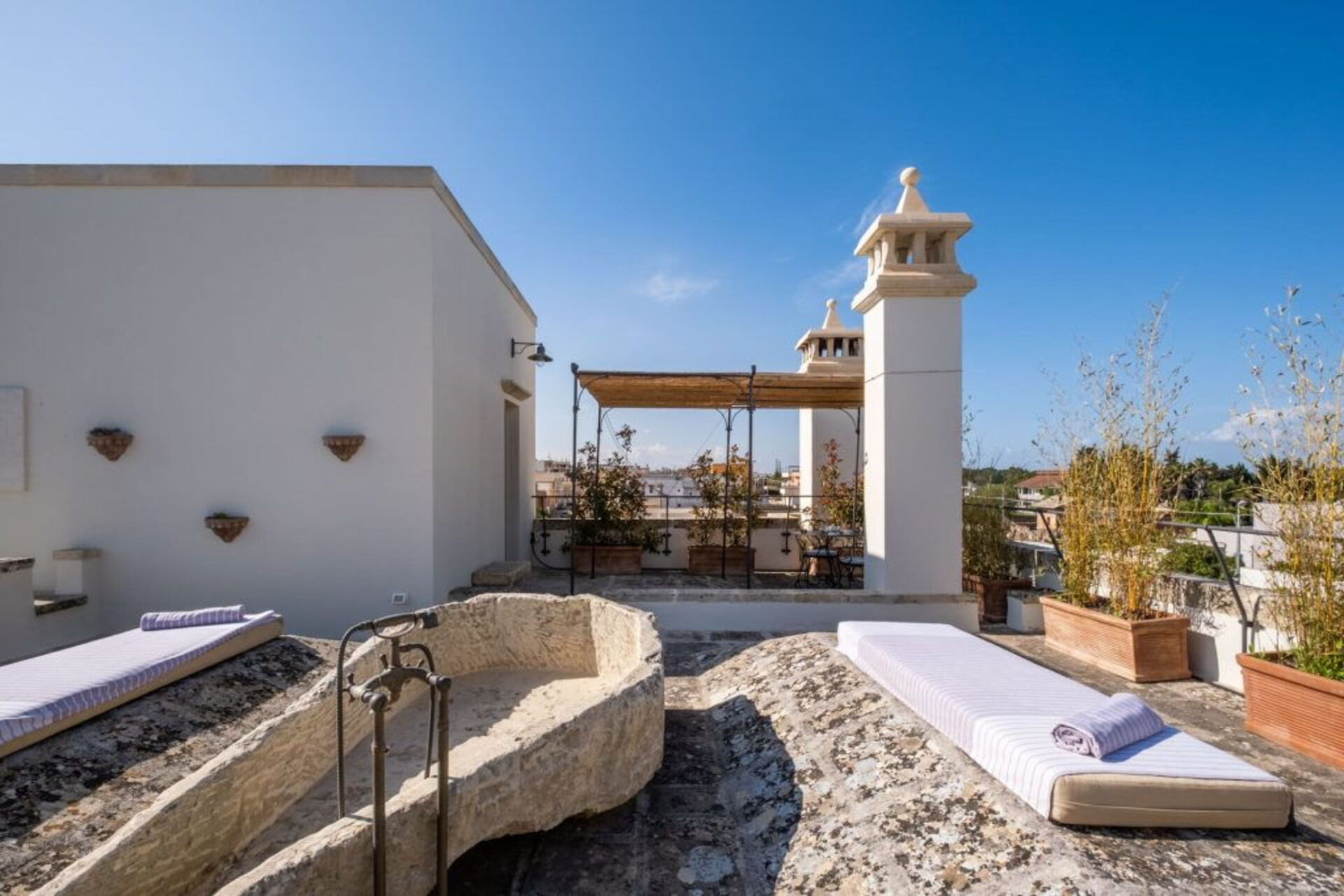 By the pool, the solarium in Lecce stone allows you to enjoy the warm Salento sun, offering an invigorating experience.