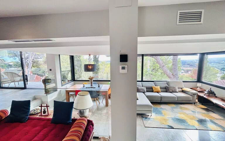 "Alta Garrotxa", villa 5 estancias 280 m2. Vivienda adecuada para 6 adultos + 2 niños. Espacioso, con mobiliario confortable: salón-comedor con TV digital. Salida a la terraza-jardín, a la piscina. 1 dorm. con 1 sofá-cama (150 cm, 190 cm de longitud), ducha/WC. Cocina abierta (horno, lavavajillas, 4 placas de vitrocerámica, tostadora, hervidor de agua eléctrico, microondas, cafetera eléctrica, isla de cocina). WC separado. Aire acondicionado, calefacción por el suelo. En planta inferior: 1 dorm. con 1 cama de matrimonio (1 x 180 cm, 190 cm de longitud), ducha/WC. 1 dorm. con 1 cama de matrimonio (1 x 140 cm, 190 cm de longitud). 1 dorm. con 1 cama de matrimonio (1 x 180 cm, 200 cm de longitud). Baño/WC. Aire acondicionado, calefacción por el suelo. Terraza-jardín. Muebles de terraza, barbacoa, tumbonas (4), rincón para sentarse. Vista panorámica al mar y al paisaje. El alojamiento dispone de: lavadora, plancha, trona, cuna hasta 3 años, secador de pelo. Internet (Wifi, gratis). A tener en cuenta: casa para no fumadores. HUTT-066172