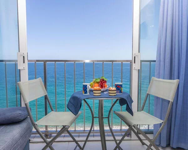 La unidad es un estudio de 24 m² distribuido en una sola planta, situado en la novena planta y con capacidad máxima para 2 huéspedes. El espacio combina sala de estar y comedor en concepto abierto, que se conecta con una alcoba equipada con una cama francesa de 135 cm de ancho y 180 cm de largo. Una zona de cocina integrada en el espacio principal y un baño con ducha y WC completan la distribución. La posición elevada en la novena planta ofrece vistas al mar.