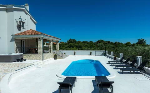 Zemunik Donji a 25 km de Zadar: Casa unifamiliar "Villa Šime", bonita de 2 plantas. A 17 km del centro de Sukošan, lugar soleado, a 17 km del mar. Privado: terreno 1'100 m2 (vallada), piscina (8 x 4 m, 140 cm de profundidad, Disponible por temporada: 01.May. - 01.Oct.). Tobogán, ducha exterior, piscina de hidromasaje, básquet (columpio). En el inmueble: acceso a internet, sauna, lavadora. Aparcamiento (para 4 coches) junto a la casa en el mismo terreno. Restaurante 17 km, parada autobús 10.3 km, playa de gravilla 17 km. Atracciones en los alrededores: NP Krka 67 km, NP Paklenica 39 km, Fun park Biograd 32 km. Lagos conocidos fácilmente accesibles: Vrana See 33 km. Grupos de jóvenes sólo bajo petición. A tener en cuenta: aeropuerto 18 km de la casa.