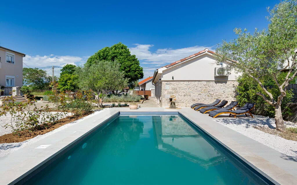 Zemunik a 10 km de Zadra: Casa unifamiliar "Stanca", bonita, reformada en 2024. A 800 m del centro, lugar soleado, elevado, a 10 km del mar, a 10 km de la playa. Mantenimiento de la piscina a través del propietario/jardinero. Privado: terreno 200 m2 (vallada), piscina en forma de riñon (7 x 4 m, 28 m2, 140 cm de profundidad, Disponible por temporada: 01.Abr. - 01.Nov.) con escalera interior. Muebles de jardín. En el inmueble: acceso a internet, lavadora. Aparcamiento junto a la casa. Tienda de comestibles 800 m, restaurante 5 km, parada autobús 5.3 km, playa de gravilla 10 km.
