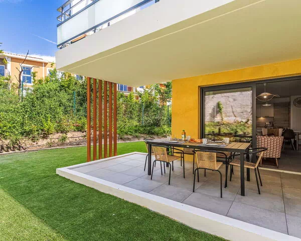 El apartamento "Le Clos des Restanques 1" tiene una superficie de 72 m² distribuida en una planta, con capacidad para 4 huéspedes máximo, 2 dormitorios y 1 baño. La planta baja alberga 2 dormitorios, cada uno equipado con una cama francesa de 160 cm de ancho y 200 cm de largo, y ambos disponen de televisor. La zona de estar y comedor es luminosa y espaciosa, equipada con televisor de pantalla plana, y se abre directamente a una terraza cubierta de 15 m² orientada al noroeste. La cocina abierta está completamente integrada en la zona de estar y dispone de lavavajillas, 3 placas de inducción, tostadora, hervidor, congelador, cafetera eléctrica y microondas combinado. El baño cuenta con ducha, WC independiente y lavabo doble. El apartamento tiene acceso a un jardín privado de 149 m².