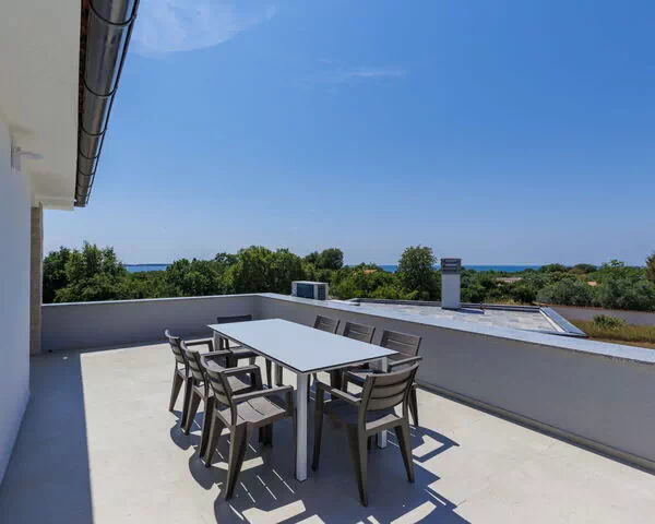 Los espacios exteriores de la villa "Kliska" han sido diseñados cuidadosamente para complementar la belleza natural del paisaje istrio. El amplio terreno vallado abarca un césped exuberante y un encantador jardín silvestre que proporcionan una atmósfera tranquila y privada. La piscina angular, que mide 8 x 4 metros con una profundidad de 140 cm, es el centro de atención del área exterior y está disponible de forma estacional del 1 de mayo al 15 de octubre; cuenta con una escalera interior. Una ducha exterior se encuentra en las proximidades para enjuagarse después de un baño refrescante. El espacio exterior también dispone de una zona de barbecue, perfecta para cenas al aire libre y tardes de verano.