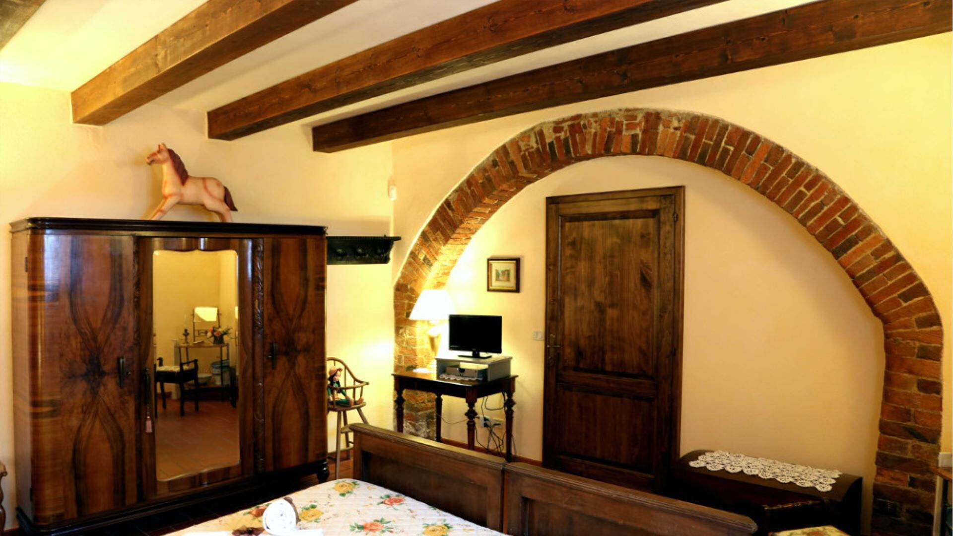 La villa aloja hasta 12 huéspedes en 6 dormitorios y cuenta con 7 baños, asegurando comodidad y privacidad para todos los ocupantes. En la planta baja encontrará tres amplias suites, cada una ofreciendo un dormitorio con cama doble, una sala de estar con sofá, un baño privado con ducha y una entrada independiente para máxima privacidad. Una de estas suites de la planta baja incluye un sofá cama doble y ha sido especialmente equipada para accesibilidad en silla de ruedas, alojando 2 huéspedes adicionales. Ascendiendo por escalones de ladrillo rojo a través de una entrada independiente, se alcanza la primera planta donde le espera una espaciosa suite con un dormitorio que contiene una cama doble, una sala de estar con sofá y un baño privado con ducha. Esta planta también alberga un segundo dormitorio con cama doble y su propio baño privado con ducha, junto con la cocina principal que presenta la típica chimenea toscana. Una escalera de hierro con peldaños de madera conduce a la segunda planta, donde descubrirá una sala de lectura y estar con un baño de servicio. La planta superior también contiene una gran suite que comprende un dormitorio con cama doble, una sala de estar con sofá cama doble que puede alojar 2 huéspedes adicionales, un baño privado con ducha y una larga terraza panorámica que ofrece impresionantes vistas a través de la campiña.
