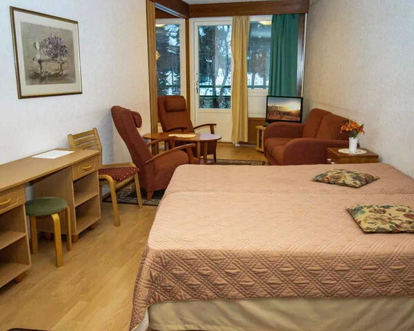 La habitación 242 del Hotel Spa es un acogedor, luminoso y espacioso apartamento de dos habitaciones situado en la 4ª planta del edificio. Los servicios del balneario Ikaalinen están a solo 300 metros. El apartamento dispone de balcón privado con bonitas vistas al lago Kyrösjärvi y la playa pública está a unos 100 metros. La distancia a Tampere es de sólo 55 km. Este apartamento tiene dos habitaciones: la primera cuenta con cocina, comedor y dos camas, mientras que la segunda tiene tres camas, zona de estar, TV y sofá cama. El cuarto de baño tiene WC y ducha. Las habitaciones se pueden separar con una puerta corredera si se desea. Tenga en cuenta que el apartamento no dispone de sauna. Los diversos servicios del balneario de Ikaalinen están a su alcance, incluidos restaurantes, un parque acuático, servicios de entretenimiento y bolera. Tenga en cuenta que los servicios del balneario no están incluidos en el precio del apartamento. Ikaalinen Spa 0,3 km, Ikaalinen 7 km, Tampere 55 km, Helsinki 237 km.