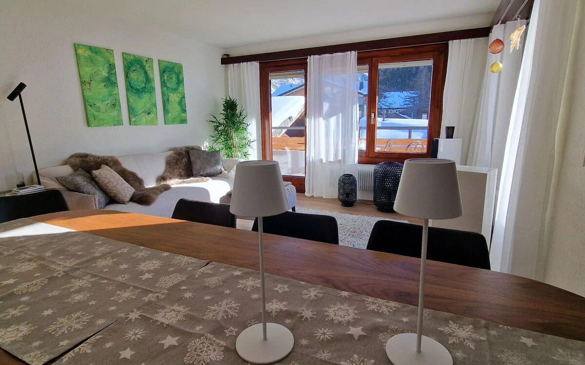 Sunny, renovated, comfortably furnished, centrally located 3 1/2 room apartment for 4 to a maximum of 8 people | Living room with a comfortable sofa, stool, a dining table with 8 chairs | TV | Internet connection | Two bedrooms with two box spring beds and closets and a washbasin each | Fully equipped kitchen with four hotplates, oven, dishwasher, Nespresso coffee machine, kettle and fridge with freezer compartment | Bathroom with bathtub, WC and washbasin | Balcony with dining table and barbecue facilities I 150 steps from the parking lot resp. 200 steps from the bus station | cheese store with a large selection of cheese and other dairy products in the same building | butcher's shop opposite the apartment | restaurants and bars in the immediate vicinity | 100 steps from the nearest grocery store (Coop). No need for tiresome cab and transport journeys to the apartment | Ski room in the cellar | Own heated locker for ski storage in the sports store near the slopes for max. four skis and boots possible for a fee