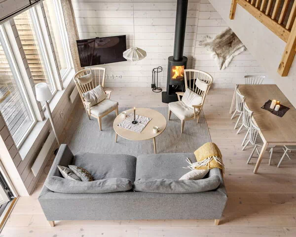 En la planta baja se encuentra una zona de estar y comedor de planta abierta, amueblada con una estufa de leña de estilo escandinavo, que conecta directamente con una cocina abierta completamente equipada y se abre a una amplia terraza orientada al sur con vistas panorámicas a las montañas y el bosque circundante.