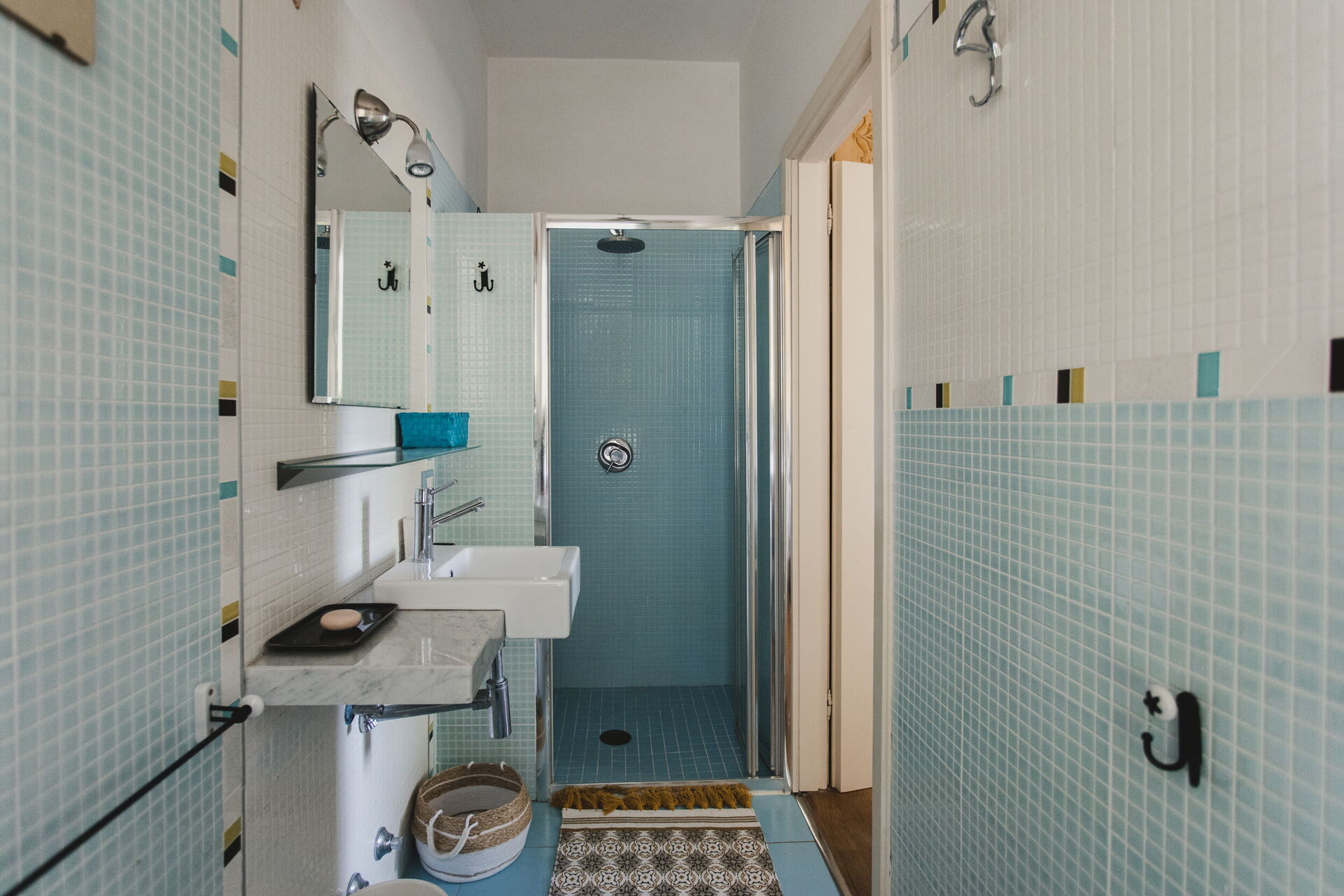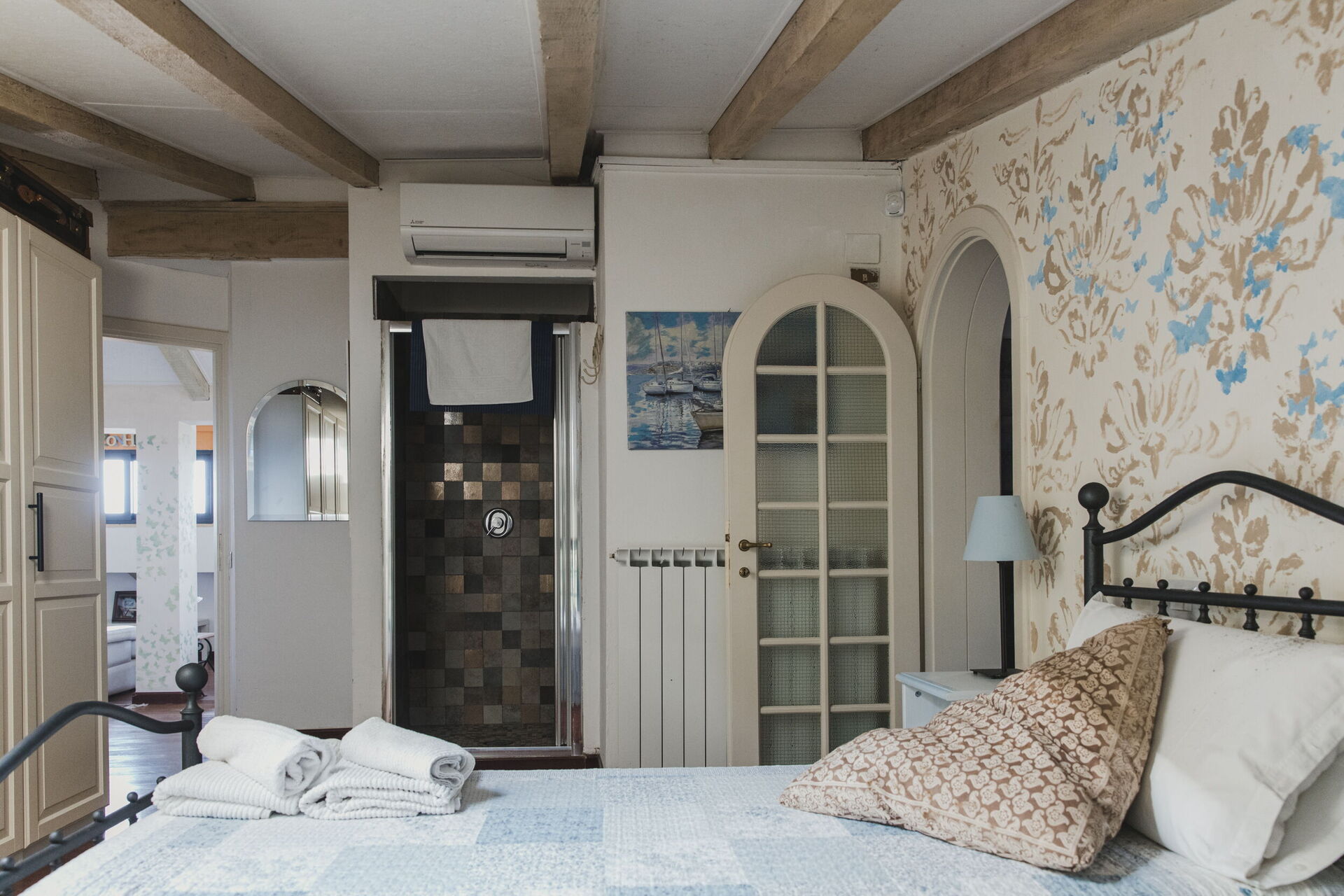 Habitación con baño 3: cama doble, aire acondicionado, lavabo, baño, bidé, ducha, secador.