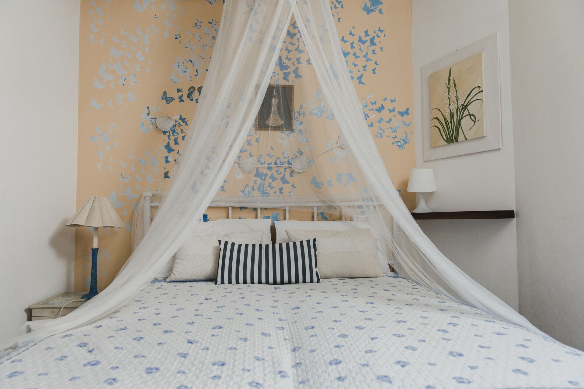 Habitación con baño 2: cama doble, cuna, cuna de bebe, aire acondicionado, televisión, lavabo doble, baño, bidé, ducha, secador.