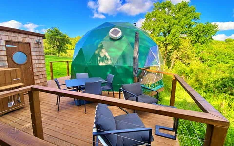 "Scotney Luxury Dome", chalet de madera 2 estancias 30 m2, en la planta baja. Vivienda adecuada para 4 adultos. Salón con chimenea. 1 dorm. con 2 camas de matrimonio. Cocina (tostadora, hervidor de agua eléctrico, microondas, cafetera eléctrica). Ducha/WC. Barbacoa. El alojamiento dispone de: plancha, secador de pelo. Internet (Wifi, gratis). Plaza de aparcamiento (2 Coches). A tener en cuenta: apartamento para no fumadores. Detector de humo.