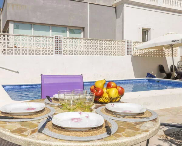 "Matilde", casa 4 estancias 90 m2. Con mobiliario confortable y agradable: salón-comedor con TV digital y aire acondicionado. 1 dorm. con 1 cama doble (2 x 70 cm, 190 cm de longitud), aire acondicionado y ventilador. 1 dorm. para niños con 1 cama abatible (70 cm, 190 cm de longitud), TV. 1 dorm. con 1 cama de matrimonio (1 x 150 cm, 190 cm de longitud), aire acondicionado y ventilador. Cocina abierta (horno, lavavajillas, 3 placas de vitrocerámica, tostadora, hervidor de agua eléctrico, microondas, cafetera eléctrica) con mesa de comedor. Ducha/bidet/WC. Jardín. Muebles de terraza, tumbonas (4), rincón para sentarse. Vista a la piscina y al jardín. El alojamiento dispone de: lavadora, plancha, mosquitera, trona, cuna, secador de pelo. Internet (Wifi, gratis). Plaza de aparcamiento (vallada, 2 Coches). A tener en cuenta: casa para no fumadores. Permitido máximo 1 mascota pequeña / perro. TV solamente ES, FR. Sin ascensor. La piscina descrita es de uso privado. VT-47384-CS // Reg. Nr.: ESFCTU00001200900034813100000000000000000VT-47384-CS8