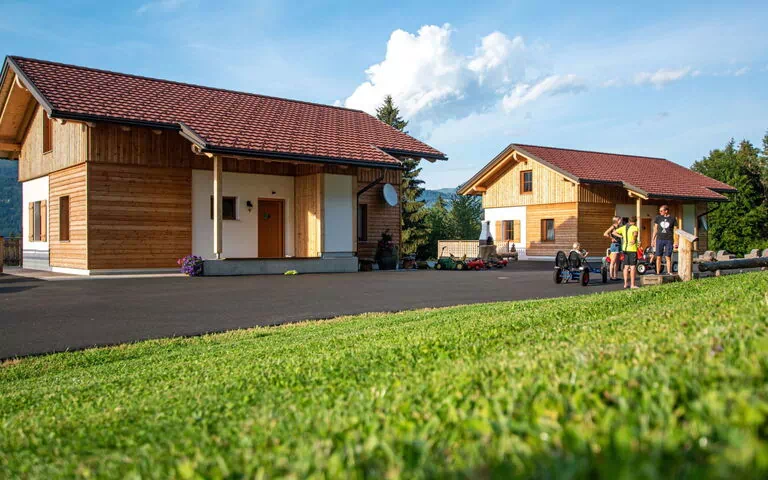 Our chalets are quietly situated in the middle of meadows and forests. Relax away from the hustle and bustle but still close enough for plenty of action on the huge playground or on our farm and in our Nassfeld Pressegger See region. The sun is shining, it's a wonderful 32° C, you lie down in one of our deck chairs, in the meantime your children are playing on our adventure playground - they can just enjoy the time. That would be a wonderful vacation, wouldn't it? Our family farm in the Carinthian Gailtal offers you all that and much more. Stroll across our meadows at sunset and enjoy the view of our breathtaking mountains. In the meantime, your children can ride a pony, feed rabbits and guinea pigs, pet kittens or take part in our children's program. Handicrafts, painting and experimenting are the order of the day for us. But that's still not all. Explore the area on foot or by bike. Dare to take a dip in the cool waters of Lake Pressegg or thePlaying carefree across our meadows, picking flowers and stroking our farm animals - these are all priceless holiday memories. Create unforgettable moments on the farm that will make your children's hearts beat faster. Your kids have a huge area at their disposal with lots to discover. But that's not all, there are numerous adventure playgrounds for big and small explorers on the adventure mountain Nassfeld. The ride on the gondola and chair lifts is also great fun. For water rats there is Lake Pressegger just 25 minutes away. Embedded in a reed belt, it is affectionately known as the bathtub of the Gailtal.After a long day of vacation, you can relax in our new 105 m² chalet. Enjoy your perfect holiday feeling Enjoy the quiet location and the spacious living area in our holiday home and relax in the sleeping loft furnished with old wood. This is based on an alpine hut in which it smells of freshly built wood. Marvel at the view of the Carinthian mountains from the panoramic window. Quiet evenings on the terrace with a glass of wine while the children romp about in the playground. Barbecue evenings with the family in the middle of nature and much more make the family holiday with us perfect and unforgettable.CHILDREN’S ADVENTURE WORLD at NassfeldIf you want to discover even more small and big adventures, take the Millennium Express gondola up the Nassfeld adventure mountain. Once at the top you will find a mountain paradise for young and old. Summiteers and climbing maxis get their money's worth as well as playground junkies. Countless adventure playgrounds are waiting to be discovered. And not only that ... On the adventure mountain you will also find several nature trails and aqua trails that you can explore with your kids. For big and small adrenaline junkies there is also a summer toboggan run, outdoor climbing park and much, much more.UNLIMITED BENEFITSHoliday Card +Our region offers you everything your heart desires. From the relaxation offer at the lake to the active offer on the mountain. With the Holiday +card in your luggage, your holiday will be even better. Because with the "+CARD holiday" you can use the gondola lift and the chairlifts and lidos for free. Guided, partly cross-border hiking and mountain bike tours as well as children's adventure programs are available. You can also use the regional bus service at no extra charge, be invited to a "golf taster session" on the golf course or visit the Möderndorf local history museum and many other facilities free of charge.